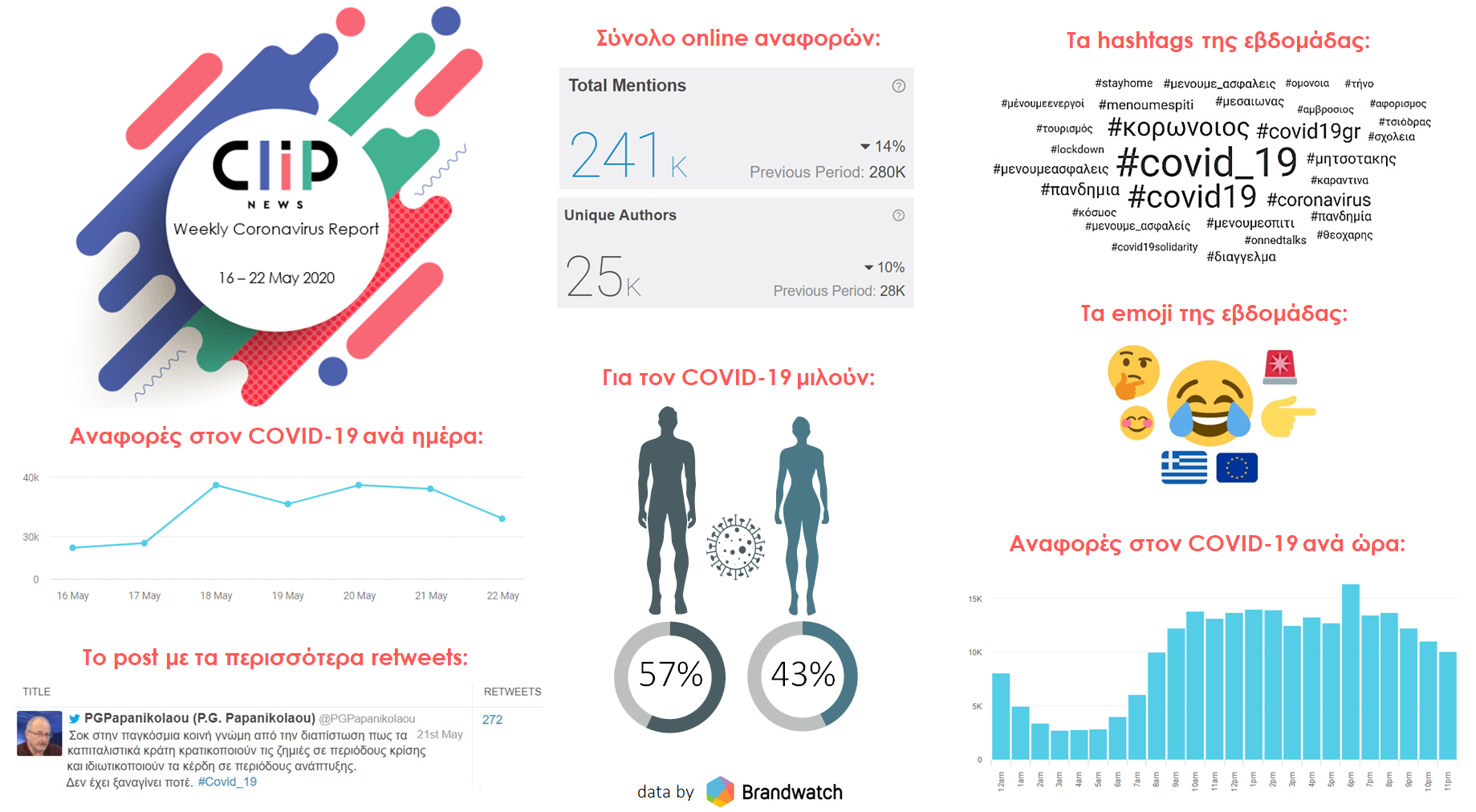 Η Clip News, εταιρεία υπηρεσιών Αποδελτίωσης, Reporting & Analysis, παρουσιάζει τις σημαντικότερες τάσεις του διαδικτύου σχετικά με τον COVID-19 για το χρονικό διάστημα 16-22/05. Η συλλογή και η ανάλυση των online δεδομένων πραγματοποιήθηκε μέσω της πλατφόρμας Brandwatch*.
