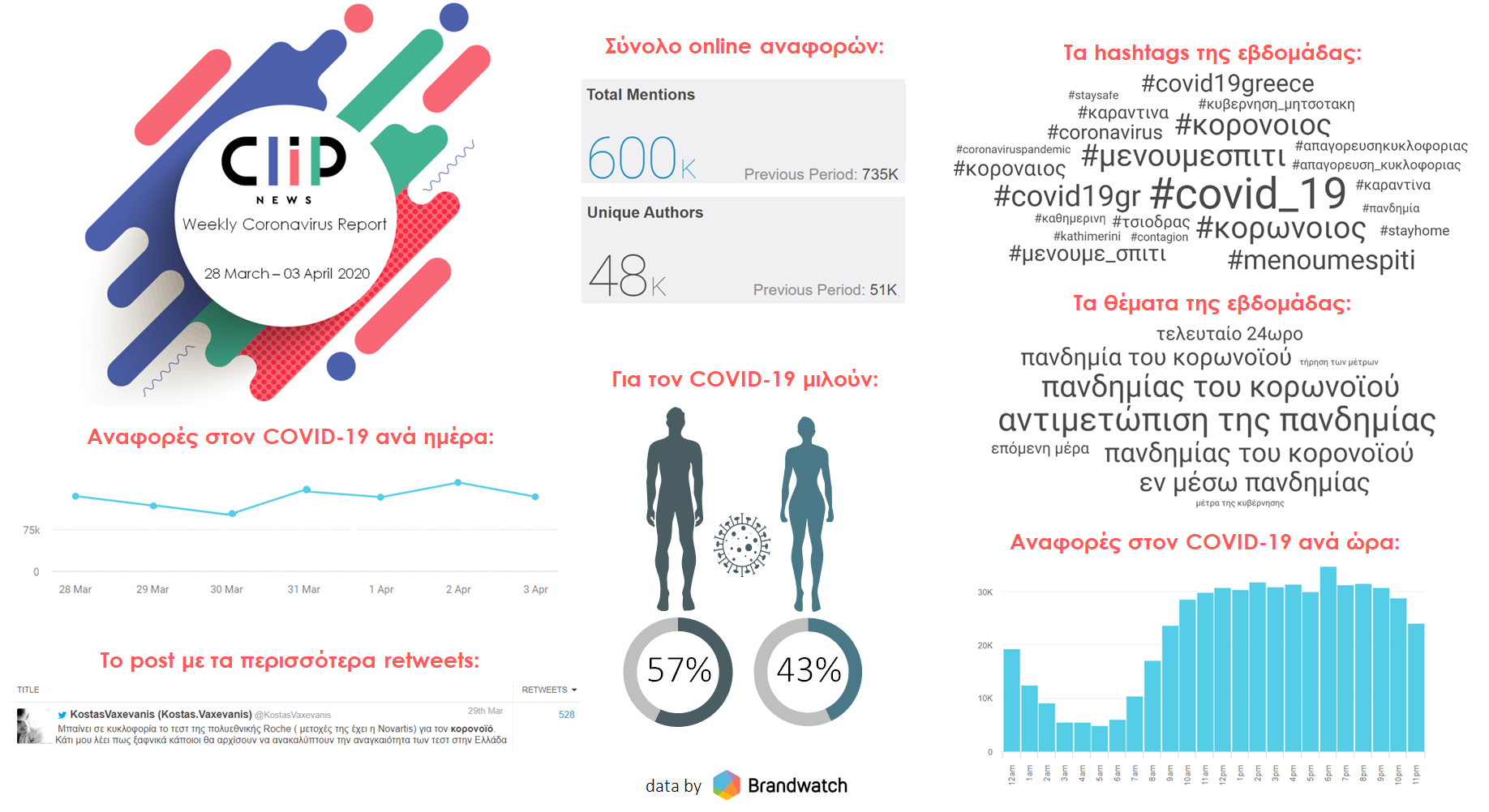 Η Clip News, εταιρεία υπηρεσιών Αποδελτίωσης, Reporting & Analysis, παρουσιάζει τις σημαντικότερες τάσεις του διαδικτύου για το χρονικό διάστημα 28/03 – 03/04 σχετικά με τις αναφορές/συζητήσεις για τον COVID-19. Η συλλογή και η ανάλυση των online δεδομένων πραγματοποιήθηκε μέσω της πλατφόρμας Brandwatch*.