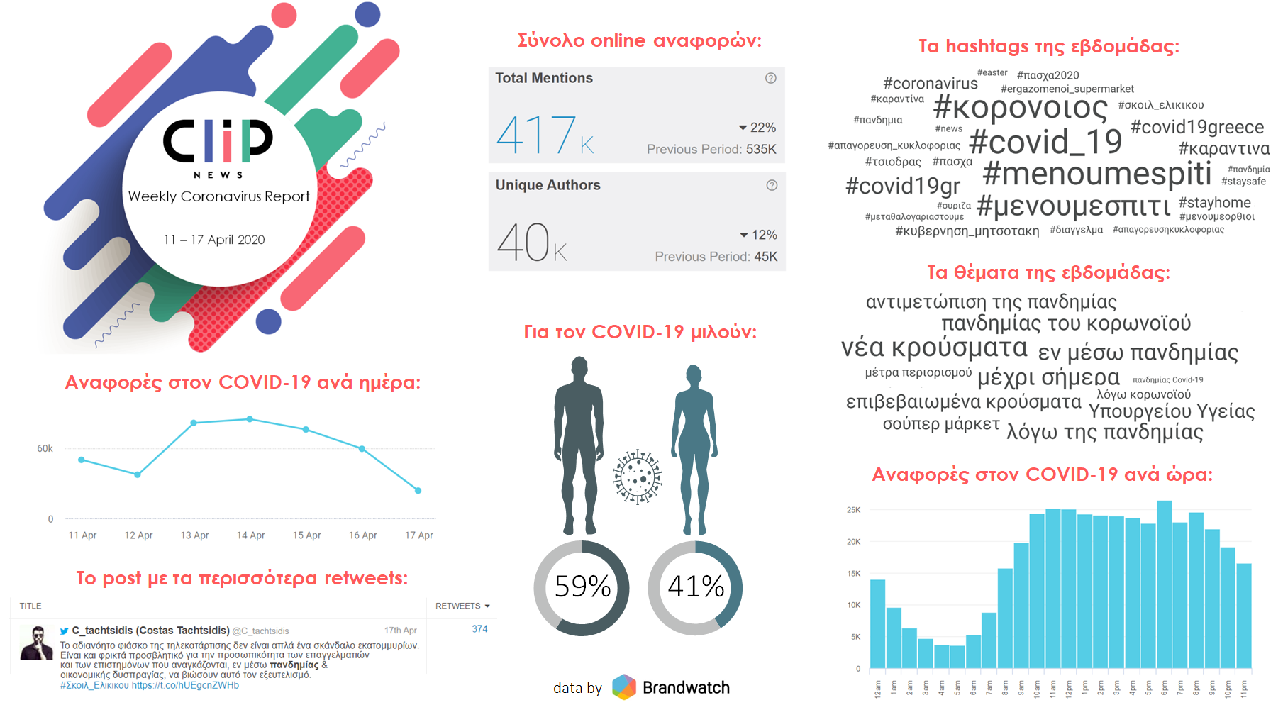 Η Clip News, εταιρεία υπηρεσιών Αποδελτίωσης, Reporting & Analysis, παρουσιάζει τις σημαντικότερες τάσεις του διαδικτύου σχετικά με τον COVID-19 για το χρονικό διάστημα 11-17/04. Η συλλογή και η ανάλυση των online δεδομένων πραγματοποιήθηκε μέσω της πλατφόρμας Brandwatch*.