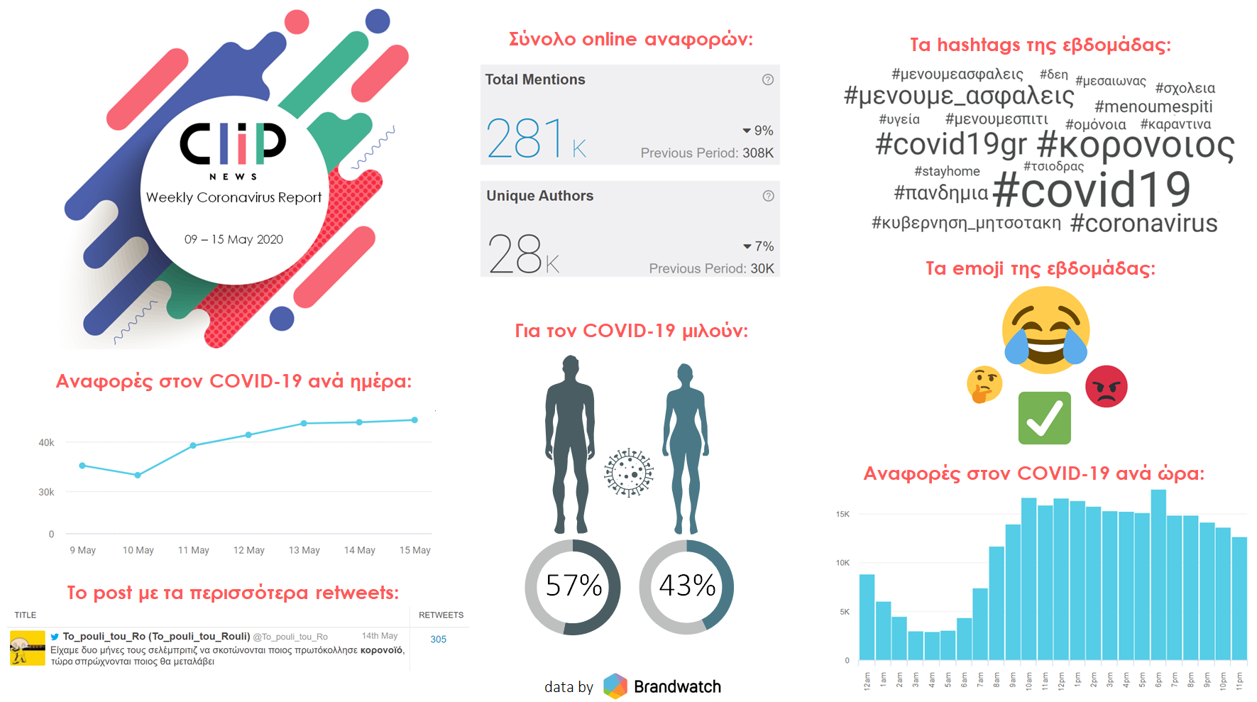 Η Clip News, εταιρεία υπηρεσιών Αποδελτίωσης, Reporting & Analysis, παρουσιάζει τις σημαντικότερες τάσεις του διαδικτύου σχετικά με τον COVID-19 για το χρονικό διάστημα 09-15/05. Η συλλογή και η ανάλυση των online δεδομένων πραγματοποιήθηκε μέσω της πλατφόρμας Brandwatch*.
