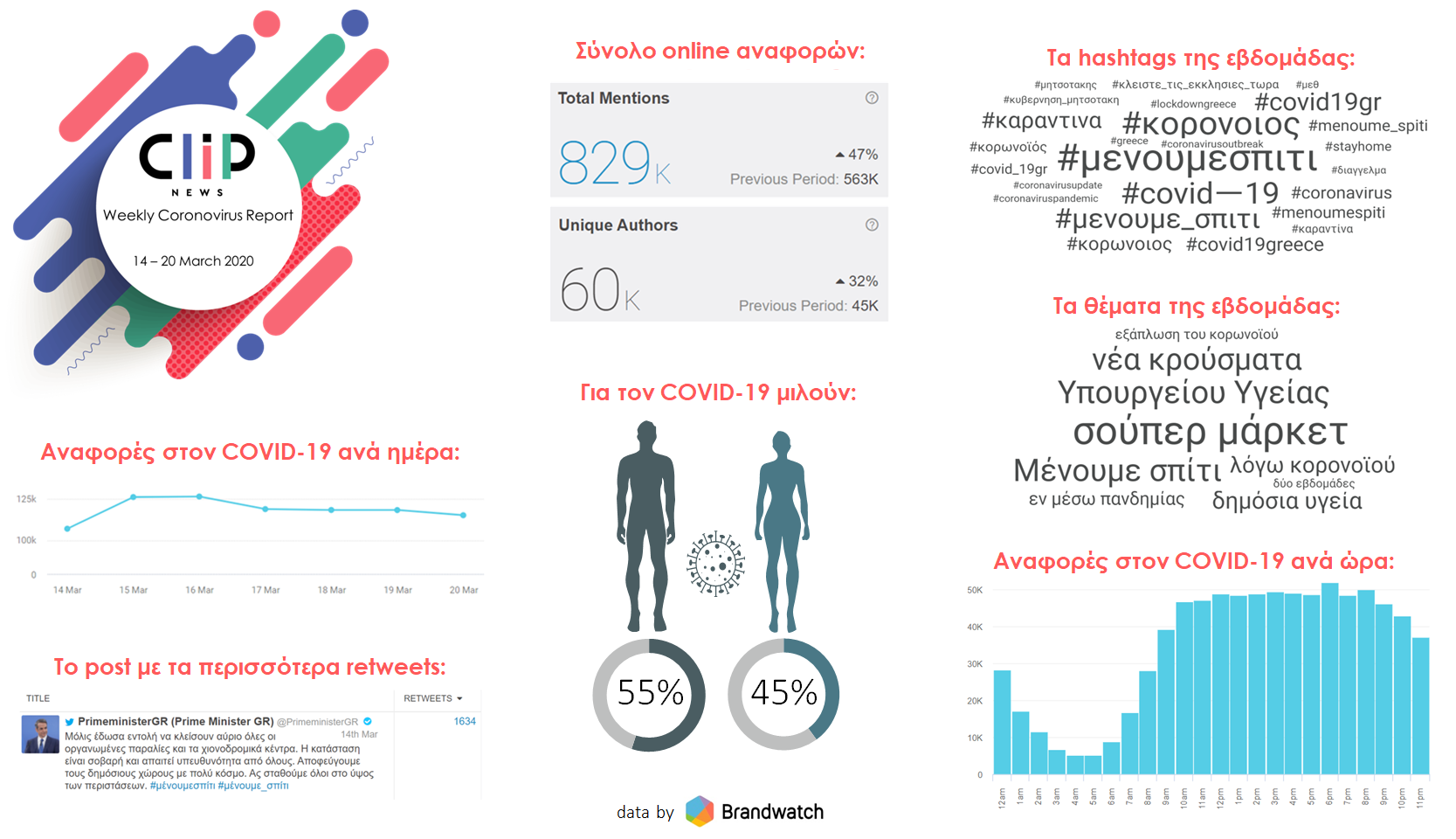 Η Clip News, εταιρεία υπηρεσιών Αποδελτίωσης, Reporting & Analysis, παρουσιάζει τις σημαντικότερες τάσεις του διαδικτύου για το χρονικό διάστημα 14/03 – 20/03 σχετικά με τις αναφορές/συζητήσεις για τον COVID-19. Η συλλογή και η ανάλυση των online δεδομένων πραγματοποιήθηκε μέσω της πλατφόρμας Brandwatch*.